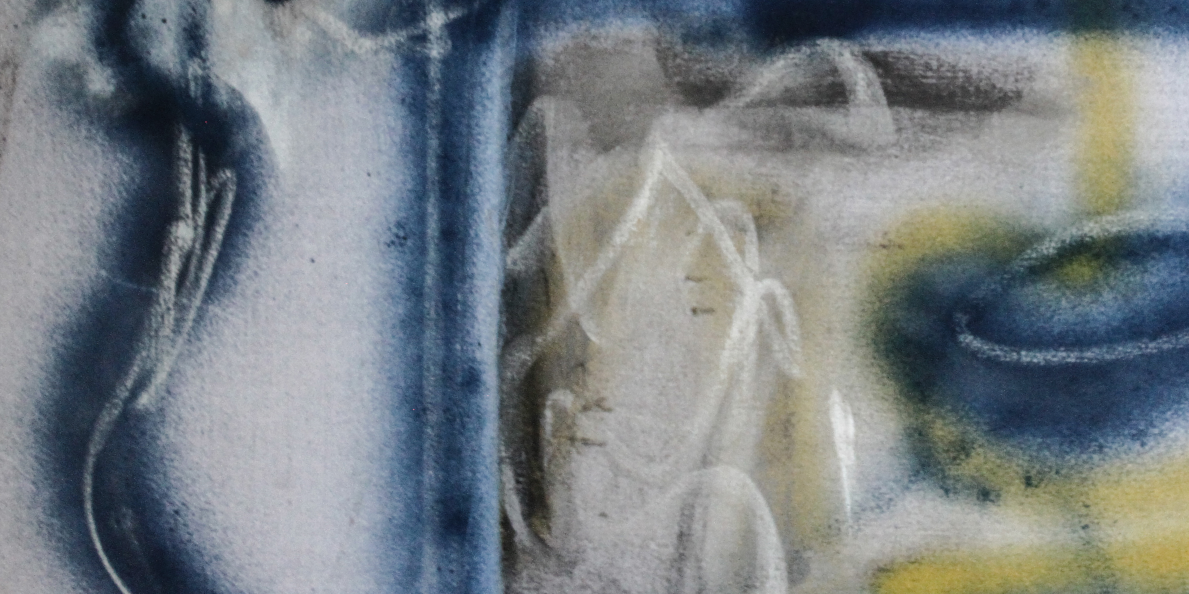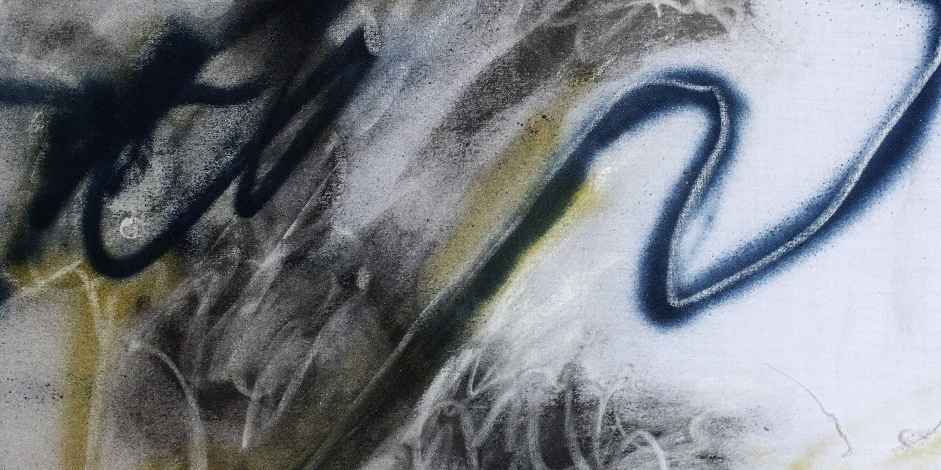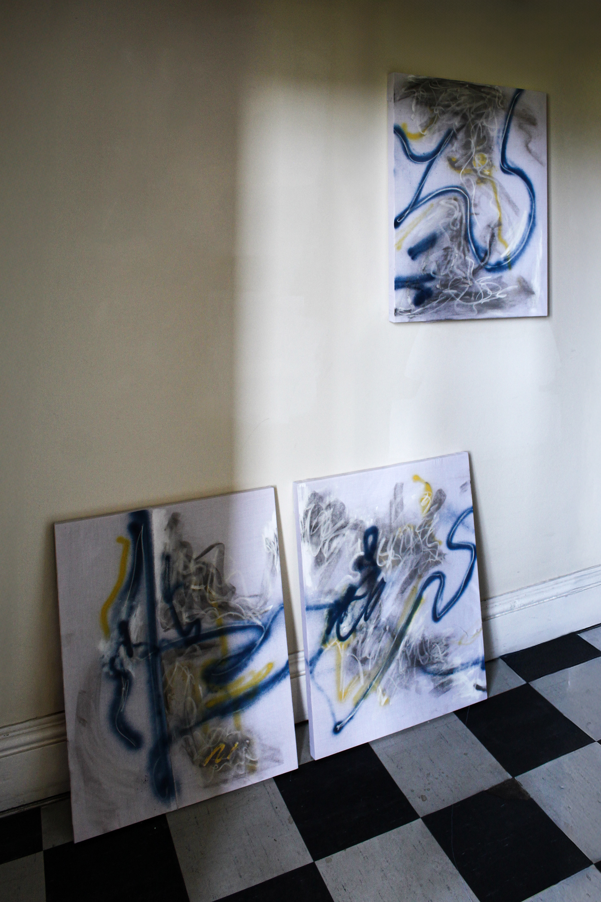 Installation view. Triptych. Cotton, Spray Paint, Chalk, Charcoal.