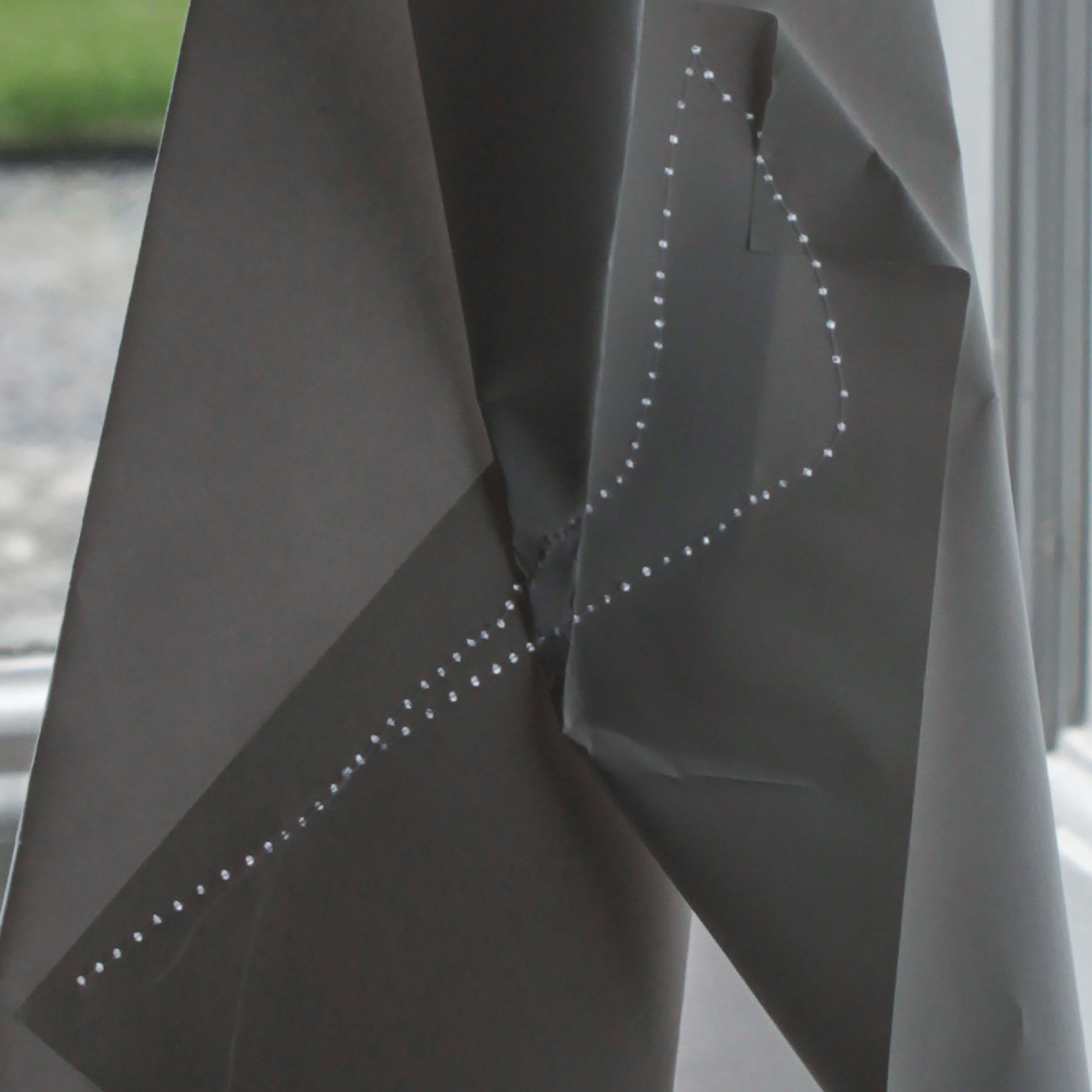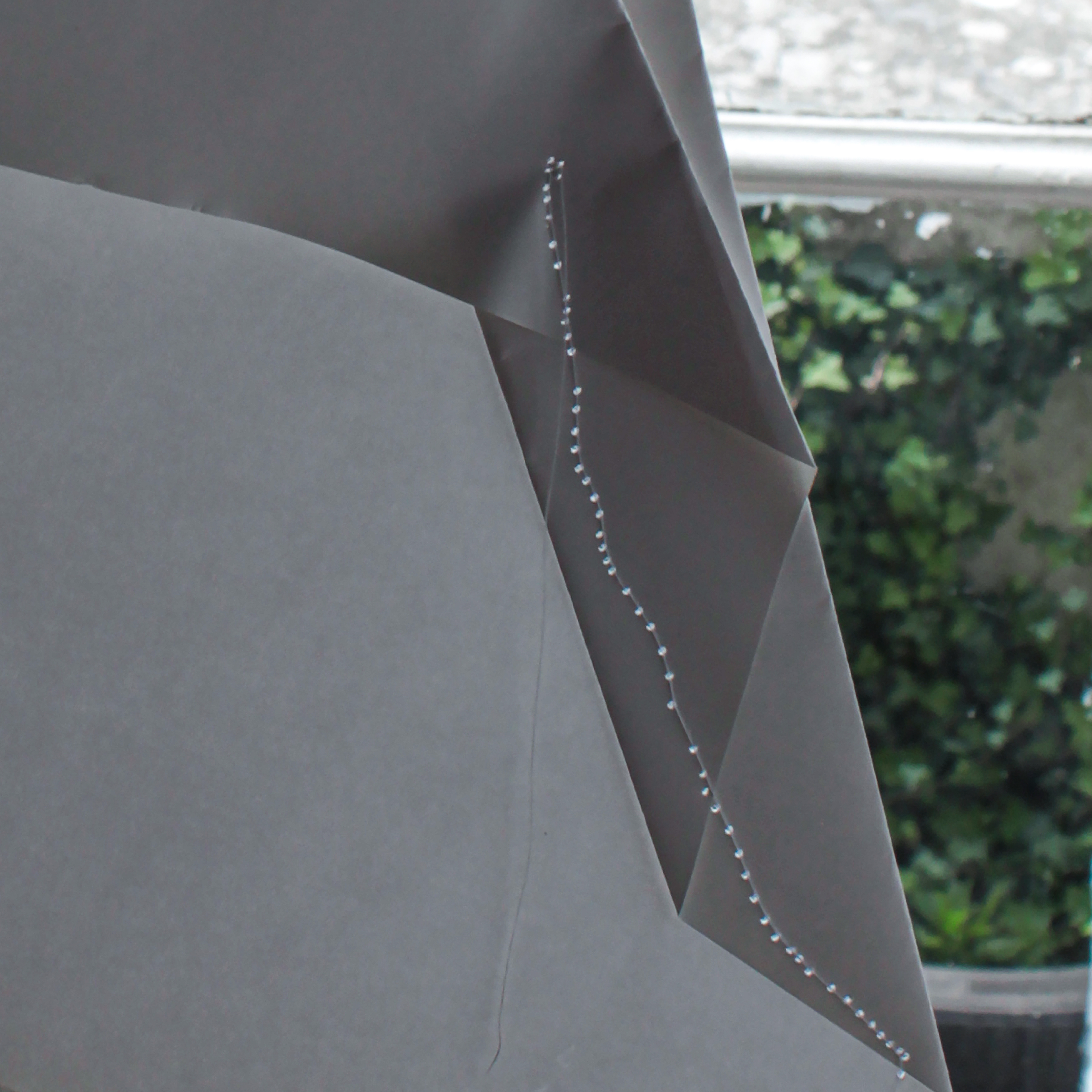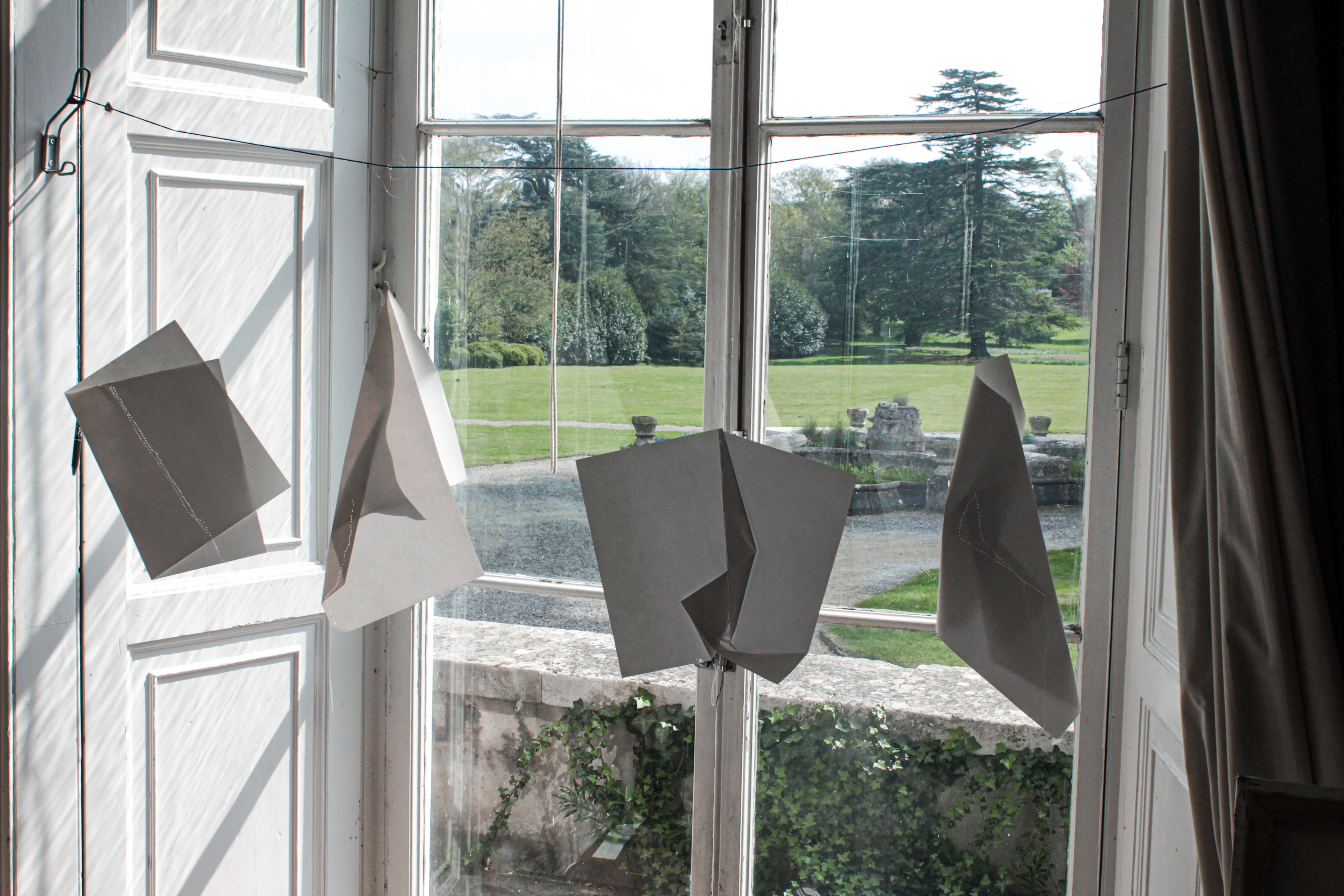 Installation view. Series of 4. Mixed sizes. Gloss paper, thread, sewing needle.