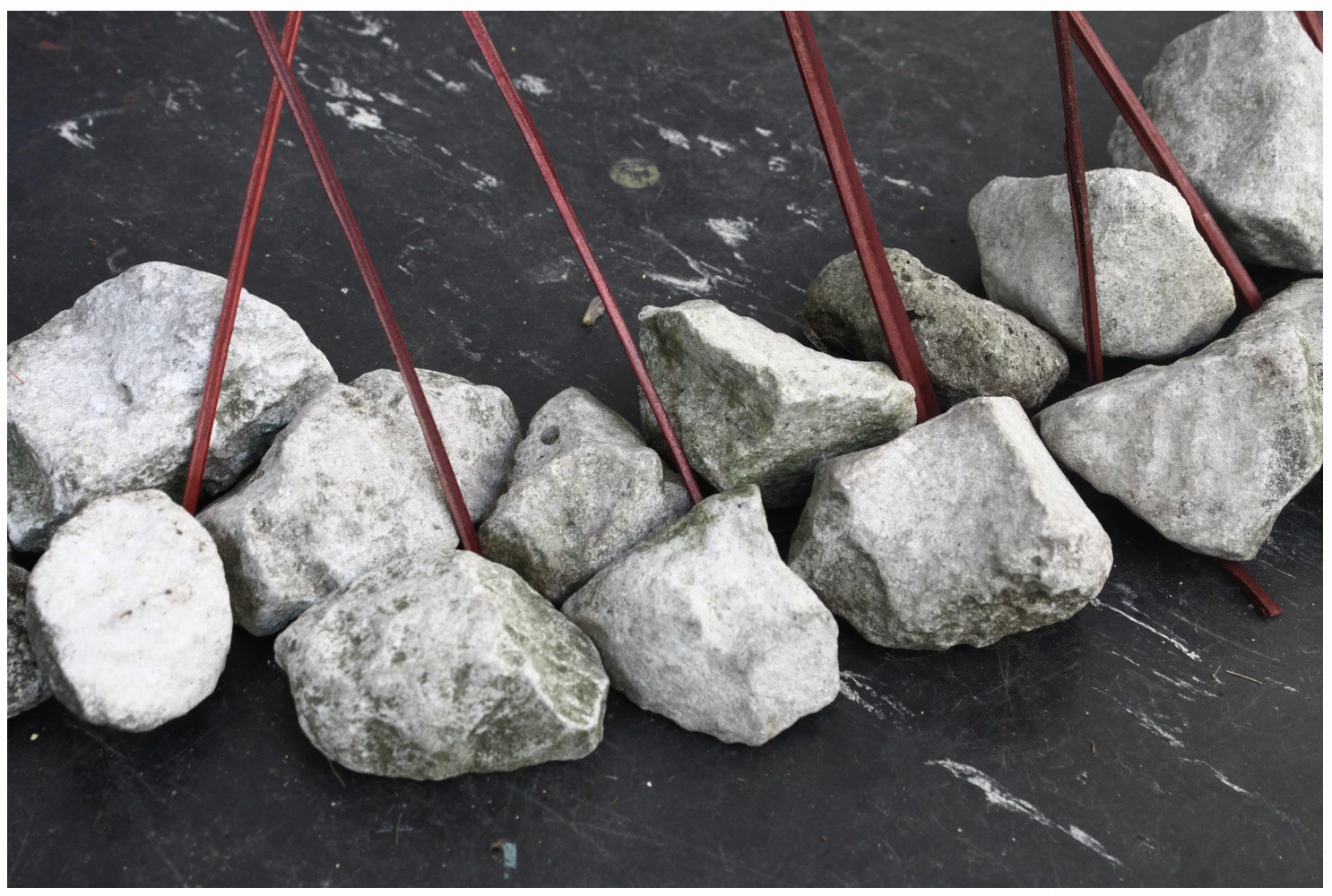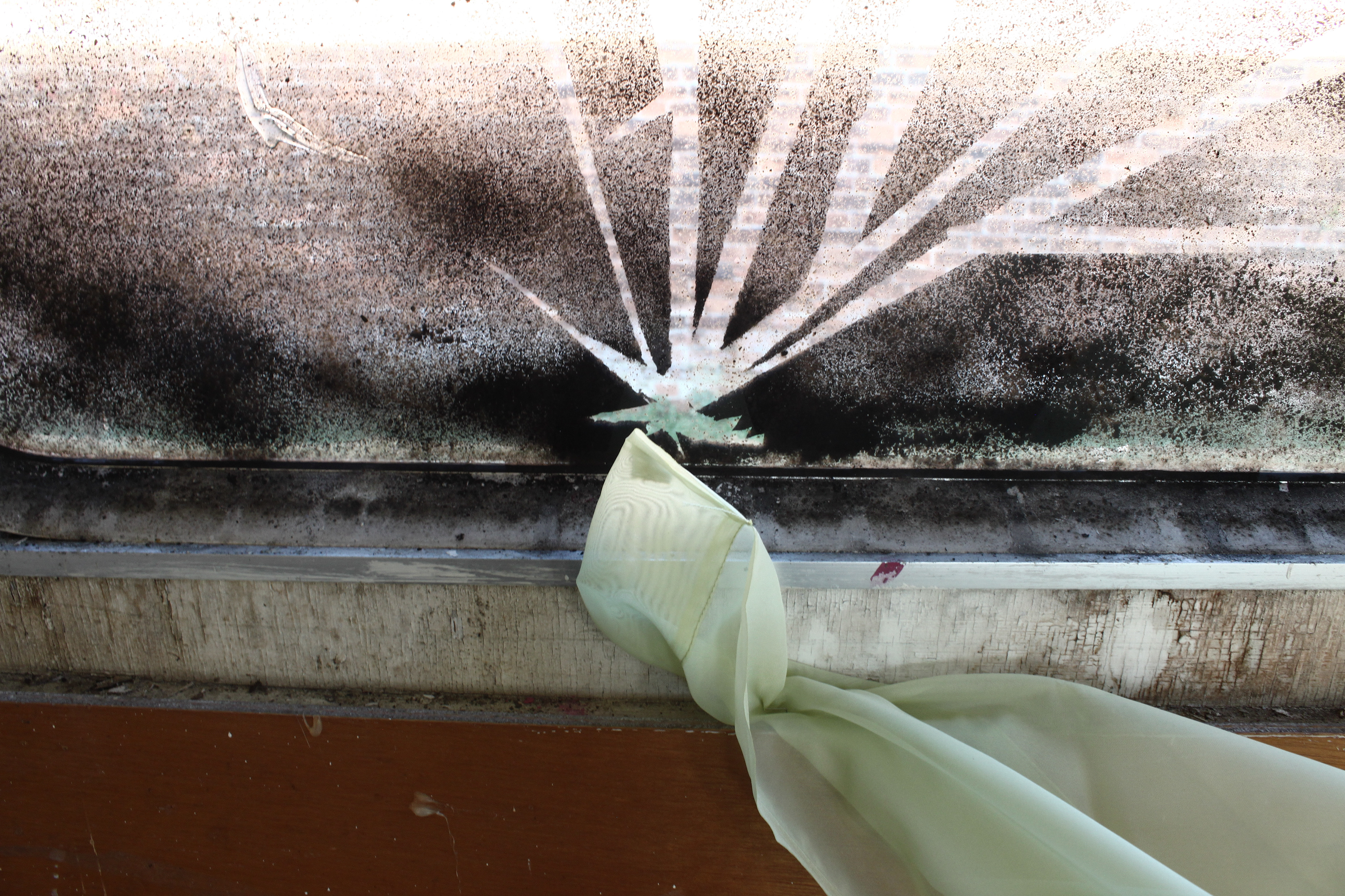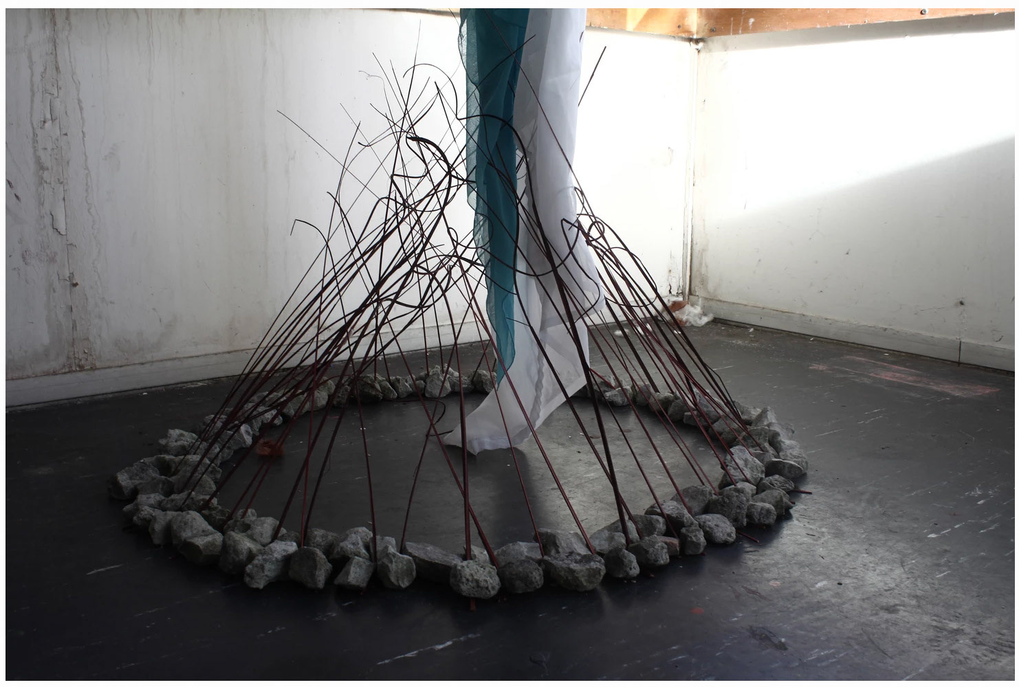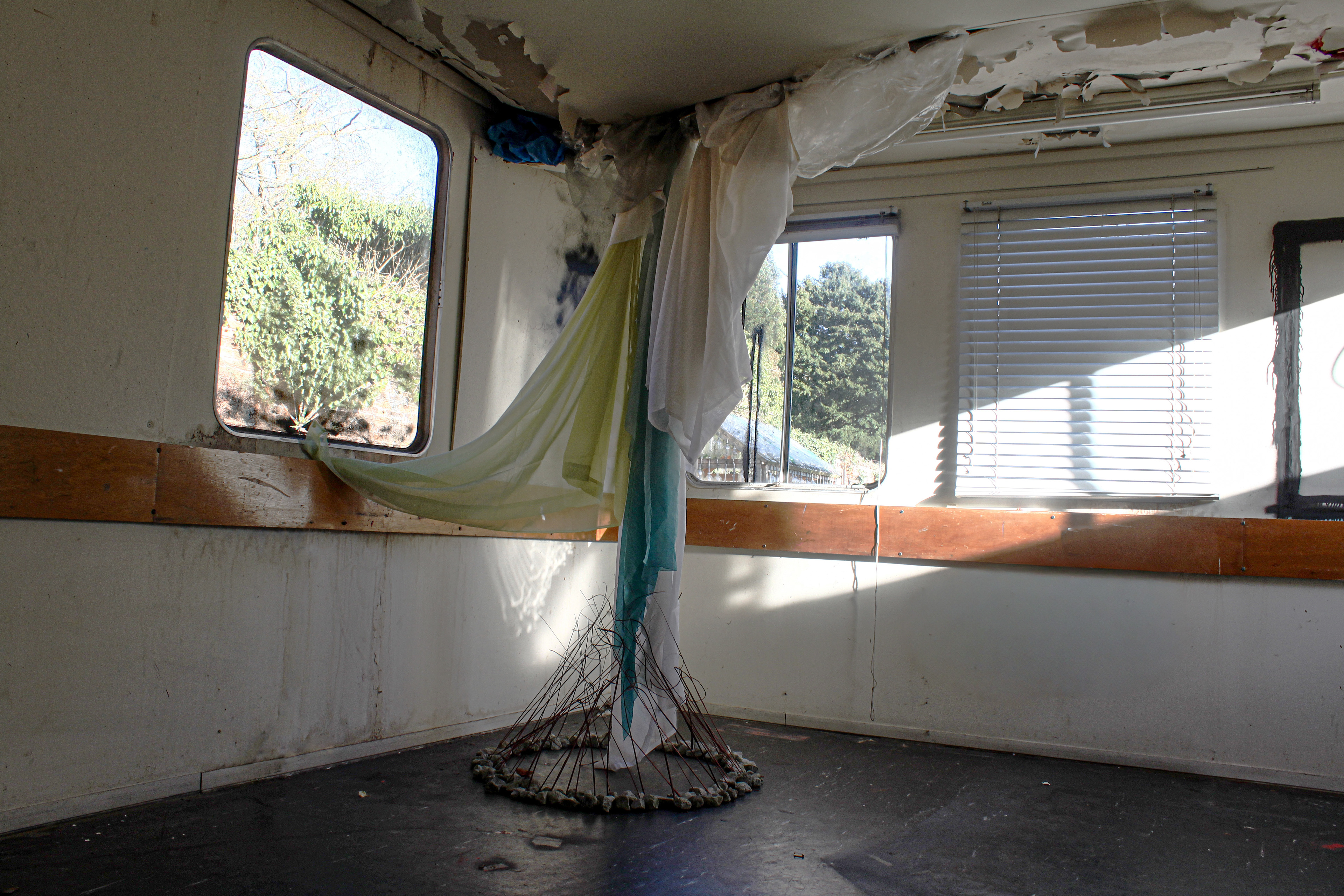 Installation in abandoned building. found fabrics, stones, wood, spray paint.